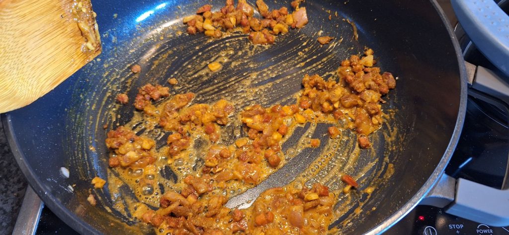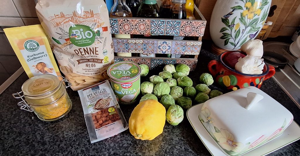 In der Zwischenzeit die vegane Butter schmelzen, Zwiebeln, Priese Zucker, Knoblauch glasig anbraten und mit dem Mehl, Curry,