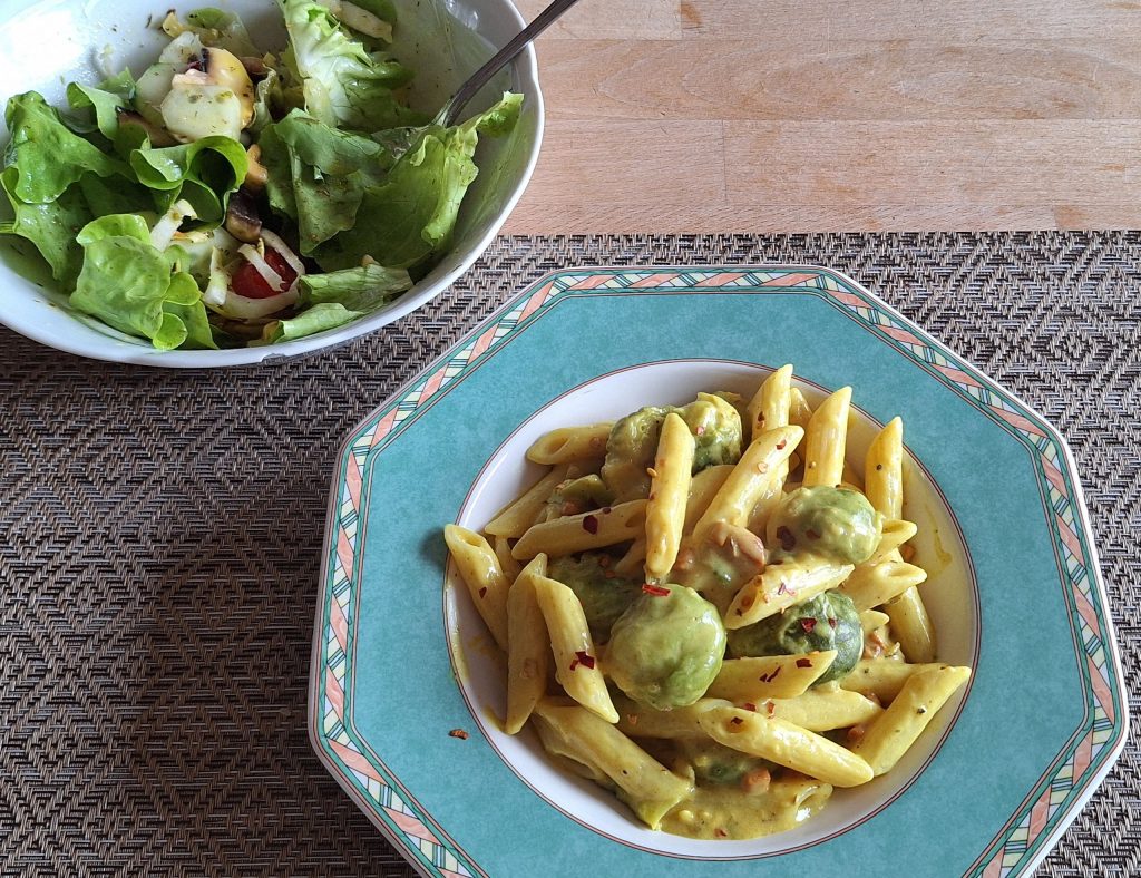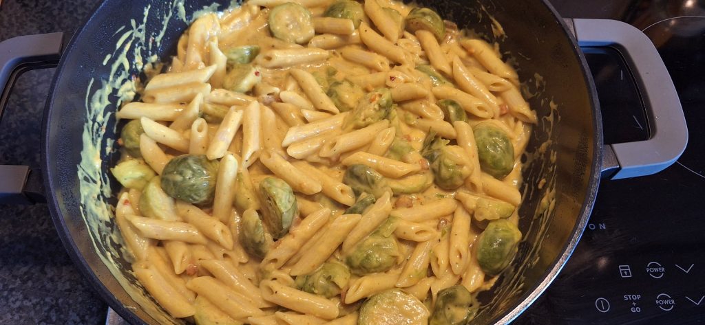 Den abgetropften Rosenkohl und die abgegossenen Nudeln mit der Soße vermischen.