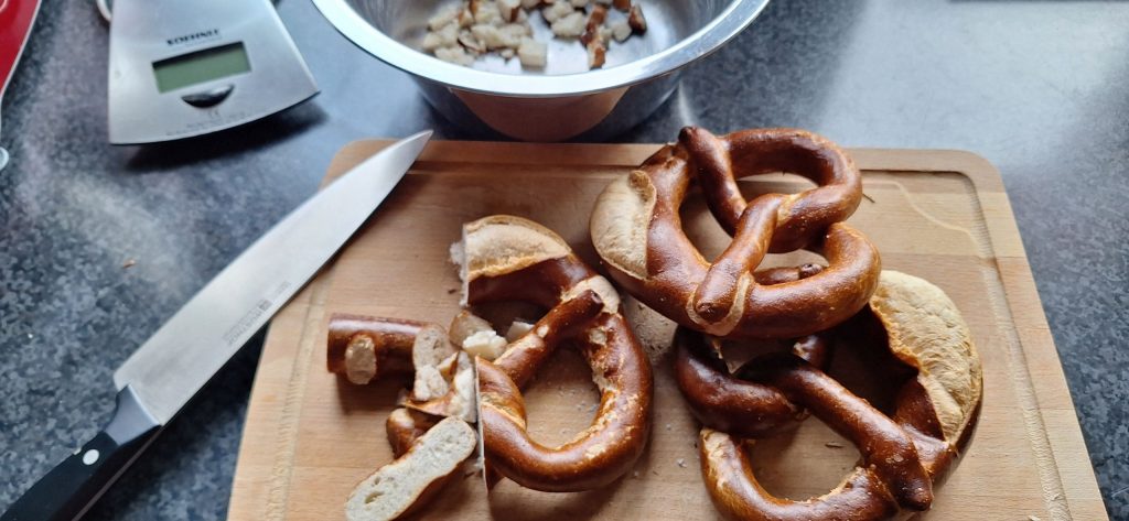 3 Laugenbrezeln – in sehr kleine Stücke geschnitten