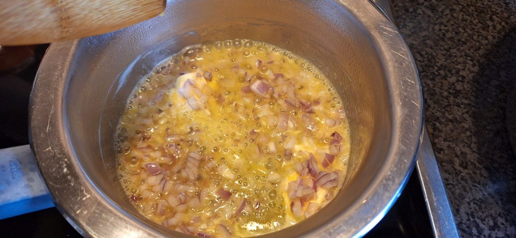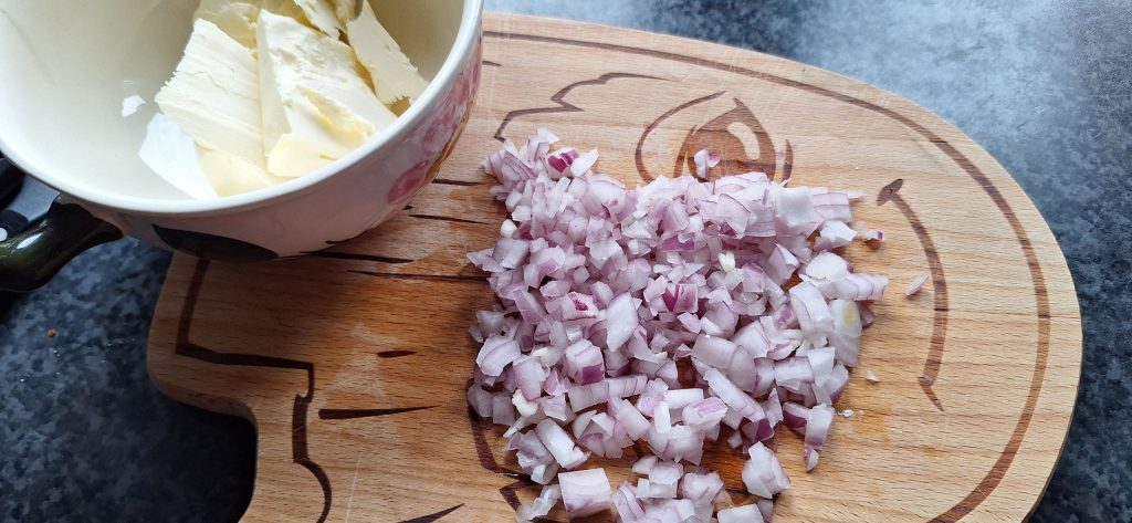 Die vegane Butter in einem Topf erhitzen und die Zwiebelwürfel glasig andünsten.