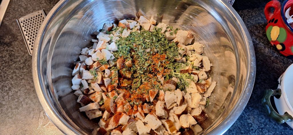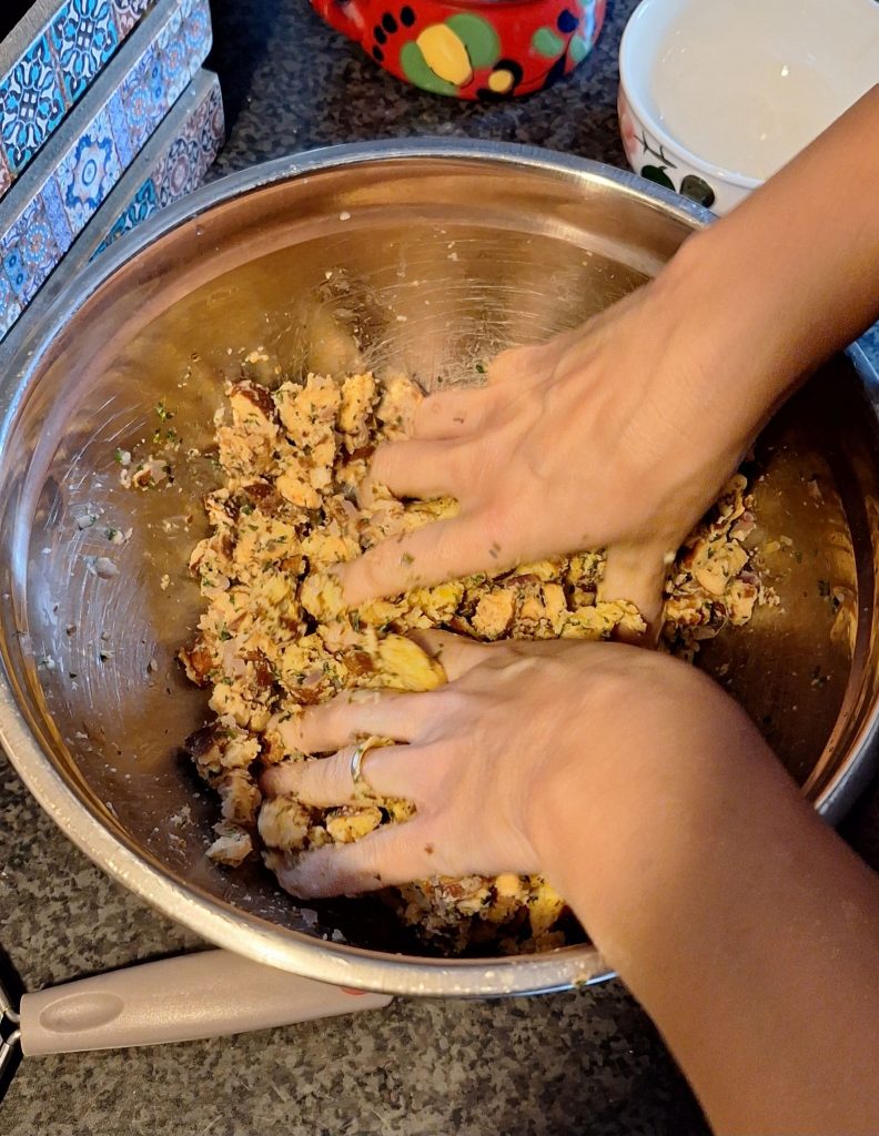 Anschließend die Brezelstücke und die Zwiebel unterrühren bzw. verkneten.