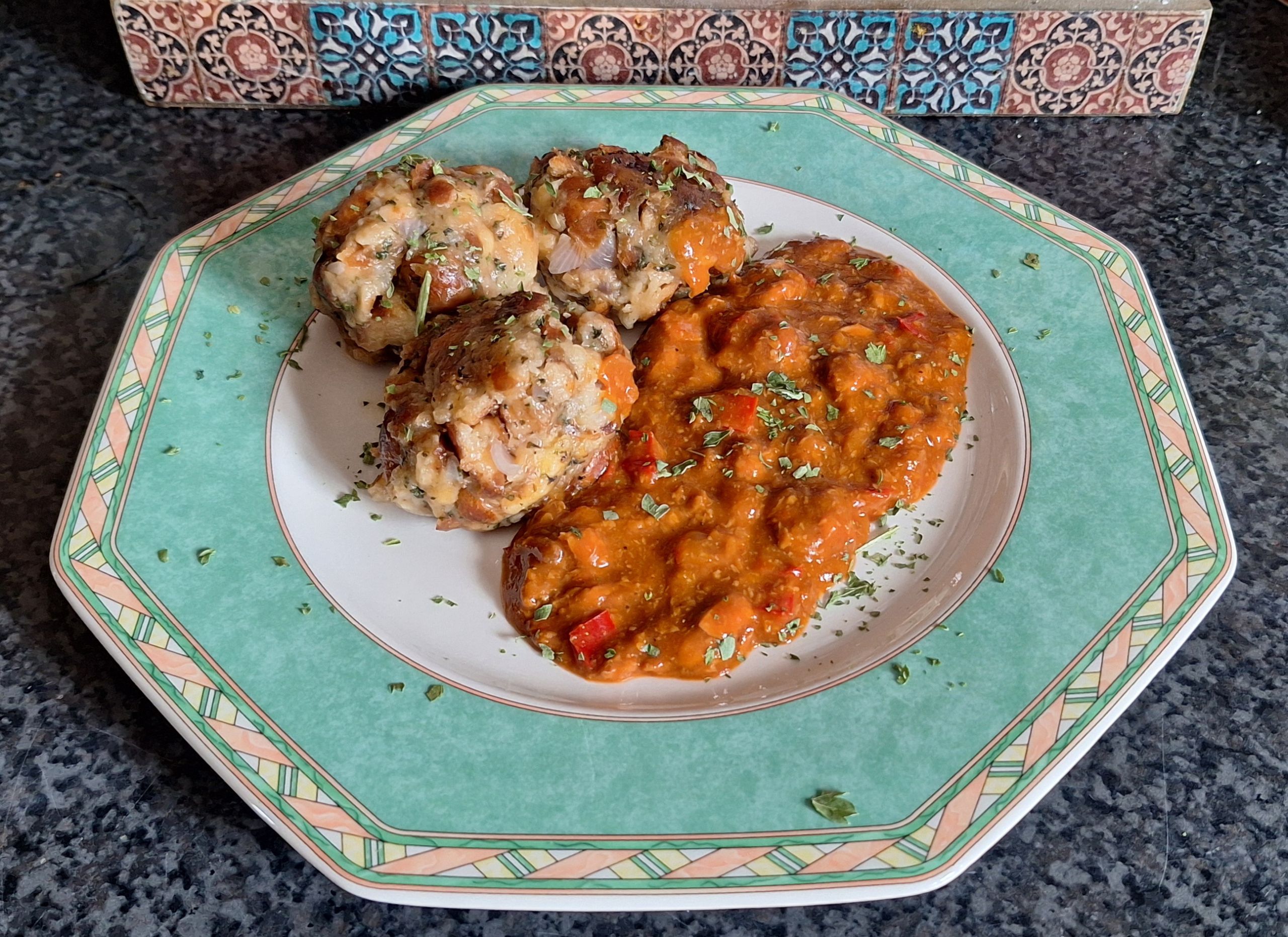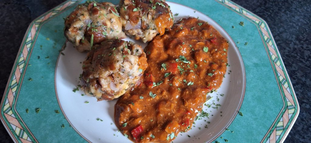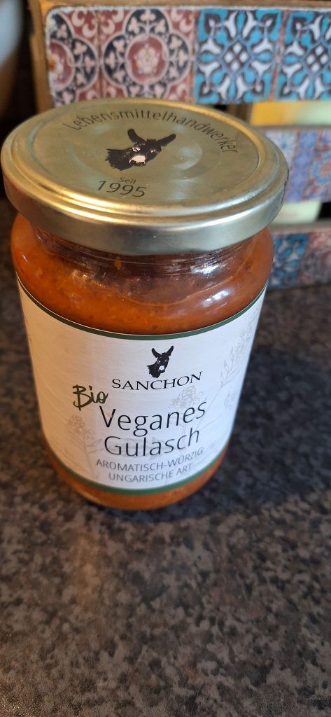 Die fertigen Brezelknödel essen wir sehr gerne mit einem veganen Gulasch, welches mal selbstgemacht aber auch gekauft wird..