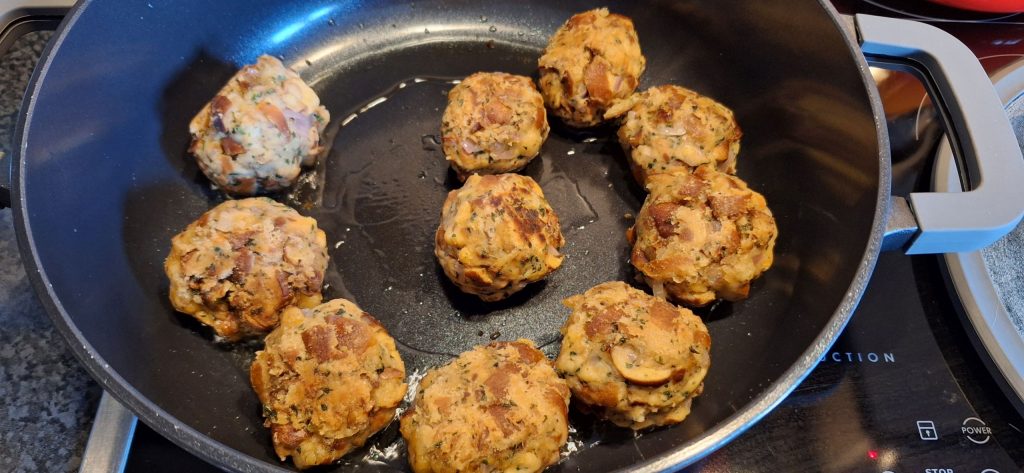 Nach den 10 Minuten werden aus der Masse ca. 10 Knödel geformt. Es ist optimal, dass während des Formens jeder Kloß nochmal gut