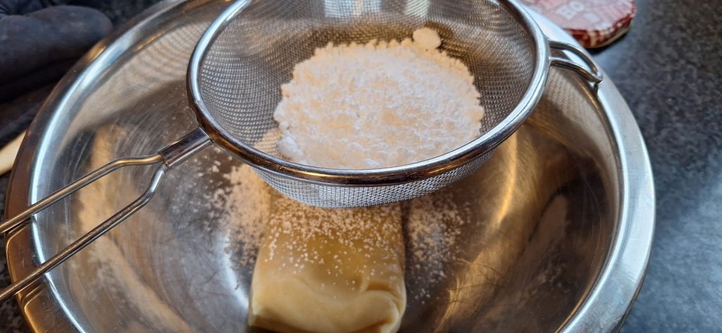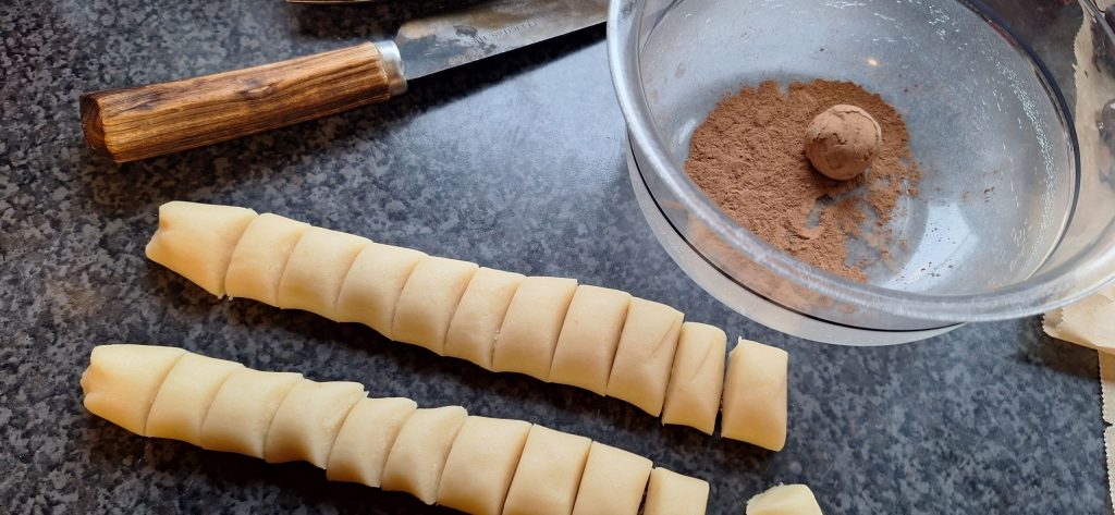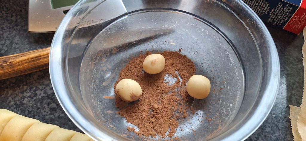 Anschließend in 2 Teile teilen und aus diesen 2 Rollen formen. Nun die Rollen in kleine Stücke schneiden und daraus kleine Kugeln formen.