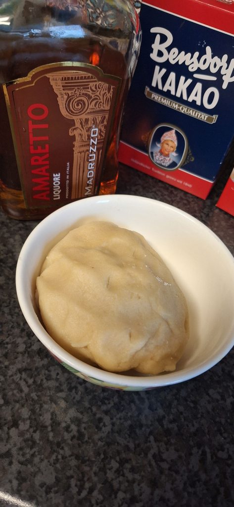 Das Marzipan mit dem gesiebten Puderzucker und dem Amaretto verkneten. Das klappt am Besten mit den Händen.