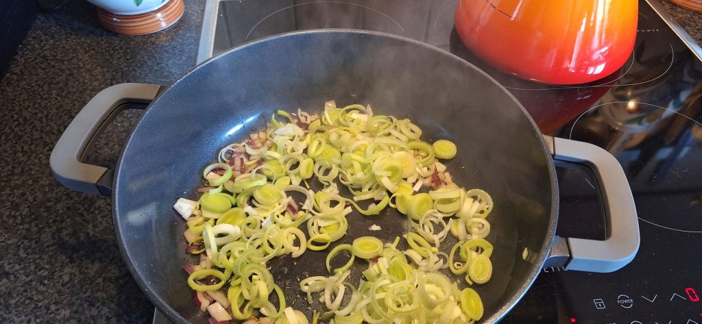 Den Lauch und den Knoblauch dazugeben und ca. 5-8 Minuten leicht anbraten.
